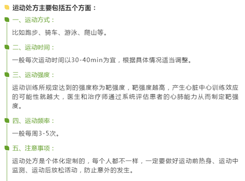 运动处方跟药物处方类似,医生在开运动处方之前会对患者进行系统评估,比如患者的生活习惯,喜欢什么样的运动,通过心肺运动试验或六分钟步行试验等来评估患者的心肺功能,制定个体化的运动处方。