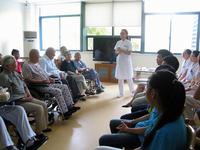 “东方红,太阳升,中国出了个毛泽东……”下午两点半,18病区活动室内,10名参加过抗战的住院康复患者及20余名医院党团员医务人员激情洋溢地唱起了一曲《东方红》,抗战老兵们回忆起一幕幕激情燃烧的岁月。他们中有的参加过抗日战争,获得过“刘伯承章”,有的参加过珍宝岛战役、炮击金门战役,有的参加过朝鲜战争、解放战争,有着“双枪老太婆”称号。他们的到场,得到全场医务人员由衷的敬意。面对穷凶极恶的日本侵略者,老兵们不同的亲历反映出当时全民抗战、救亡图存的中华民族誓死抵抗的民族气节,在场听众无一不受到震撼和鼓舞。许多革命前辈还带来了他们的军功章,医务人员纷纷与革命前辈合影,共同分享纪念抗战胜利70周年蛋糕,团员青年们还向他们送上绿色长青植物,祝他们健康长寿。
