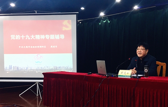 “学习领会党的十九大精神,必须坚持全面准确,坚持读原著、学原文、悟原理,做到学深悟透,着重把握十个‘深刻领会’”周建军从十个方面,对党的十九大提出的新思想、新论断、新要求、新任务作了全面系统而又突出重点的解读。周建军指出,全面理解、准确把握党的十九大精神,要深刻领会党的十九大主题,深刻领会习近平新时代中国特色社会主义思想的历史地位和丰富内涵,深刻领会党的十八大以来党和国家事业发生的历史性变革,深刻领会中国特色社会主义进入了新时代,深刻领会我国社会主要矛盾的变化,深刻领会新时代中国共产党的历史使命,深刻领会实现第一个百年奋斗目标和向第二个百年奋斗目标进军,深刻领会社会主义经济建设、政治建设、文化建设、社会建设、生态文明建设等方面的重大部署,深刻领会国防和军队建设、港澳台工作、外交工作的重大部署,深刻领会坚定不移全面从严治党的重大部署。对于如何学深学透十九大精神,周建军表示,要正本清源学、系统比较学、与时俱进学、联系实际学,共产党人的“初心”就是为中国人民谋幸福,共产党人的“使命”就是中华民族的伟大复兴,坚持“不忘初心、牢记使命”就是要为人类谋和平与发展。