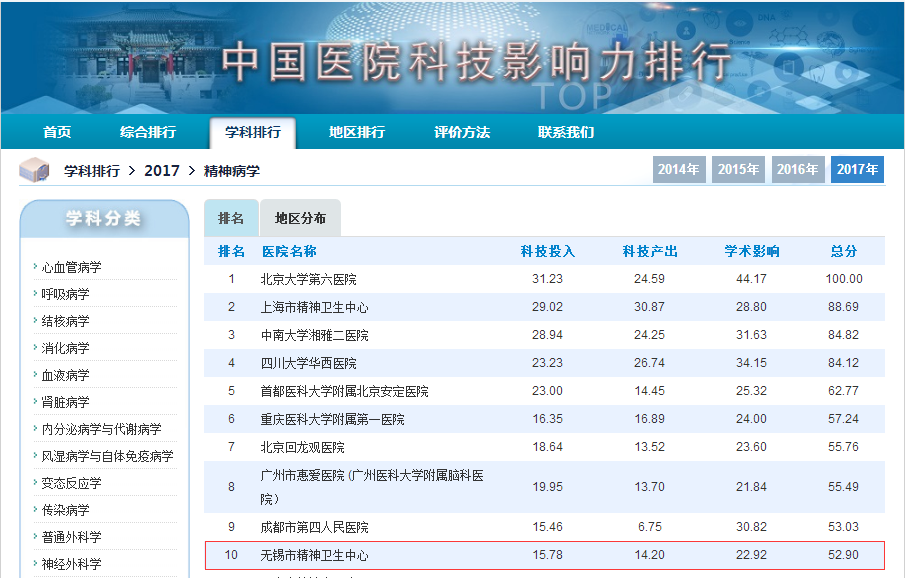 医者匠心于行,承生命之重。一路走来,两家医院成为互促共赢的一株并蒂莲,医务人员秉持“匠心精神”,以质量立医、以管理促医,建立每月医院工作排行榜发布机制,持续提升医疗服务品质,成为“环境公园化、服务人性化、管理科学化、技术专业化”的品牌医院,吸引省内外患者慕名就诊。2017年,无锡市精神卫生中心成功跻身2017年度中国医院科技影响力排行榜精神病学第10名,成为无锡首家也是唯一一家进入“中国医院科技影响力排行榜”前十强的医院。