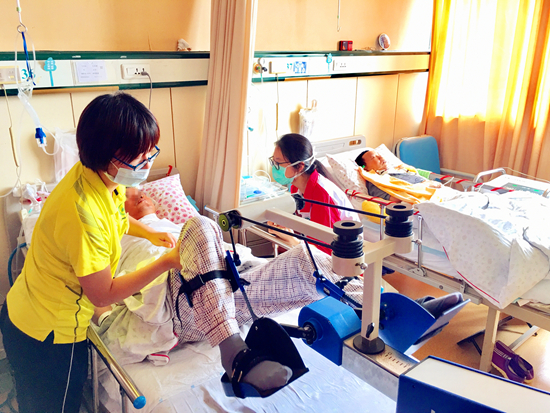 重症康复科于海燕主任表示,随着人口老龄化,像周老伯这样的病人越来越多,因为临床急危重病会引起全身脏器功能的衰竭,很多患者虽经积极抢救也会出现多个系统的功能障碍。周老伯的病是属于重症监护病房获得性肌无力,因为肺部感染抢救给予呼吸机支持通气后出现四肢瘫痪、肌肉萎缩导致神经系统以外的吞咽和运动功能受损,在重症患者中可以达到40%以上。除了重症医学科室的有效预防以外,早期康复治疗是最好的方法,能够避免骨骼肌肉的流失,缩短急重疾病的恢复时间,减少医疗支出,提高生活质量。